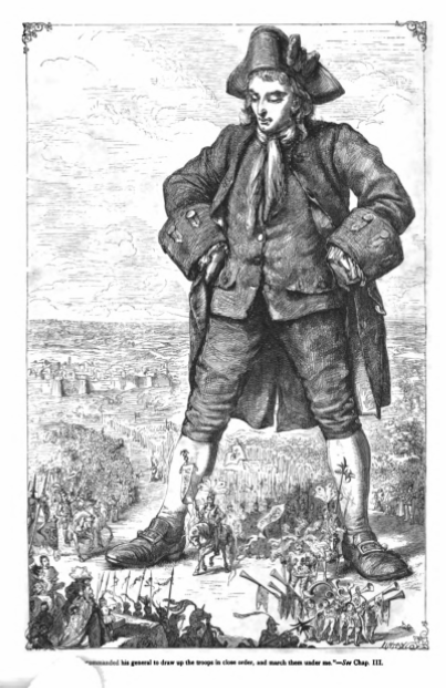 Here we see Gulliver standing as a triumphal arch for a Lilliputian military procession. The caption is a quote from the third chapter of Part One and is partially obscured. Gulliver stands with his hands on his hips and his legs wide as the Emperor of Lilliput leads the procession. Soldiers and cavalrymen march underneath Gulliver as a crowd looks on.