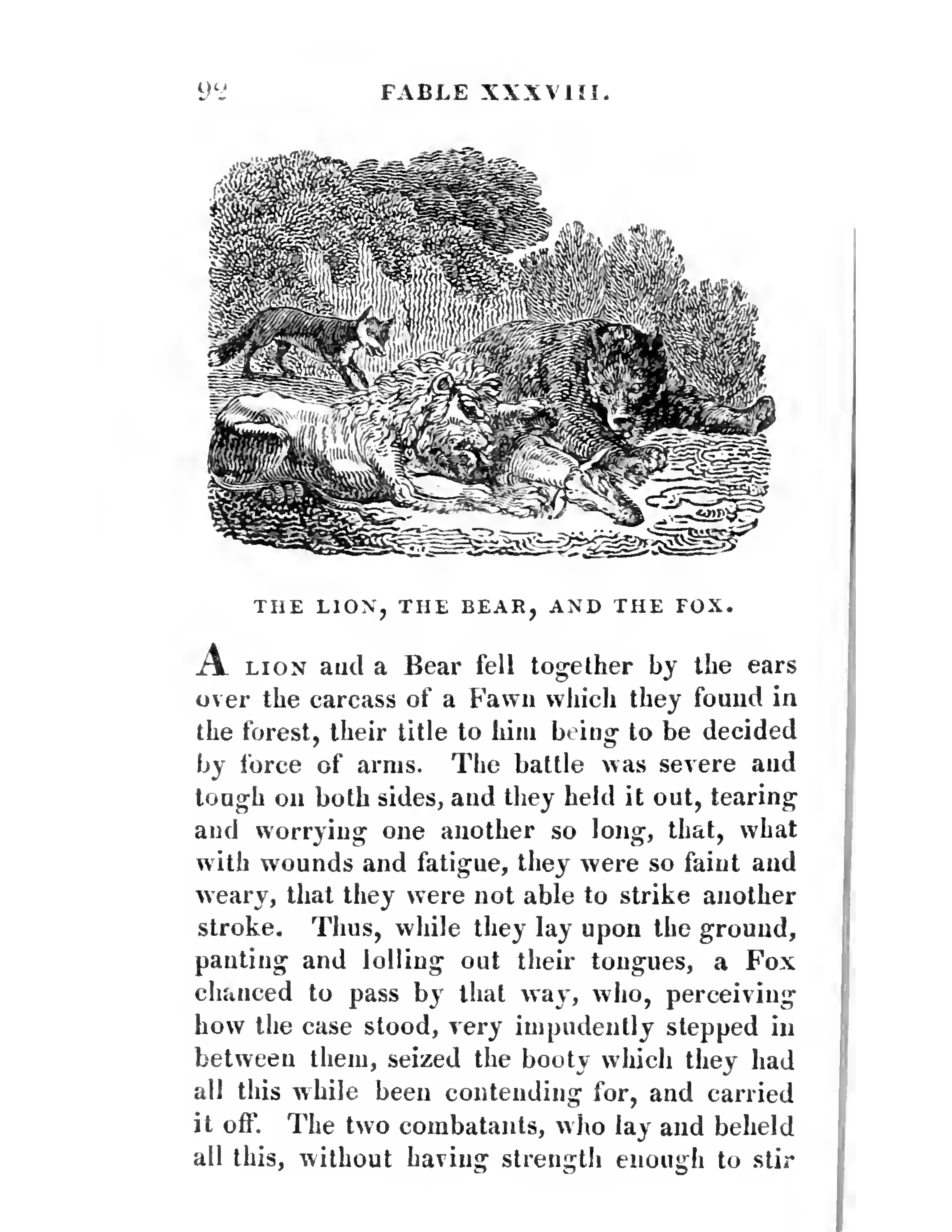 On the left there is a lion laying on the ground facing right. The lion is in the midst of eating a dead animal (likely a gazelle). On the other side of the dead animal is a bear looking at the animal and laying on the ground. Far behind these two animals is a fox on the left facing right looking at the dead animal. The rest of the background is covered in trees and bushes.