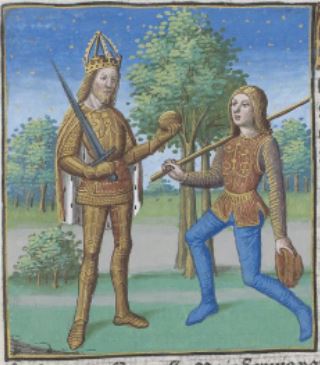 This image appears in the chapter that treats Soaemias of Emesa. Soaemias was the mother of Emperor Varius Elagabalus and the concubine of Emperor Caracalla. She was so revered by her son that he insisted that she attend meetings of the Senate, which was significant as women had never attending these councils. The image itself does not seem to reflect any part of Boccaccio’s telling of this story. There is a man on the left side of the image holding a sword and an object in his hand as a younger man stands in front of him with a stick over his shoulder.