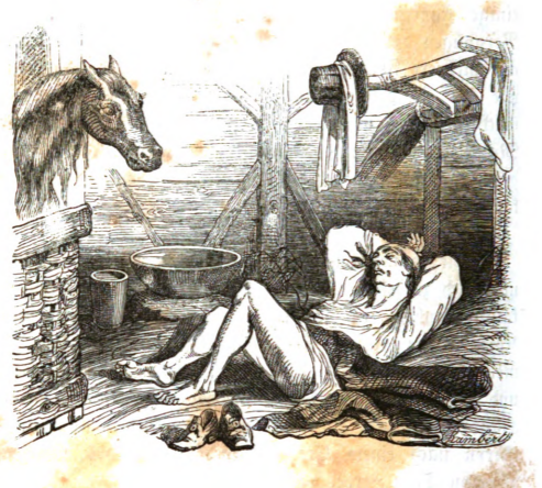 The Houyhnhnms were astonished that the only skin visible on Gulliver was on his hands and face, as the yahoos were completely naked. This served as a distinction between Gulliver and the other yahoos. It was Gulliver’s custom to undress at night and cover himself with his clothes. His master’s valet walked in on Gulliver while he was sleeping, and his clothes had fallen off and discovered that Gulliver’s body was the same as the yahoos. His master was astonished by this, and Gulliver explained how clothing worked. Gulliver asked him to keep this information to himself. The same image appears in the 1843 Krabbe edition.