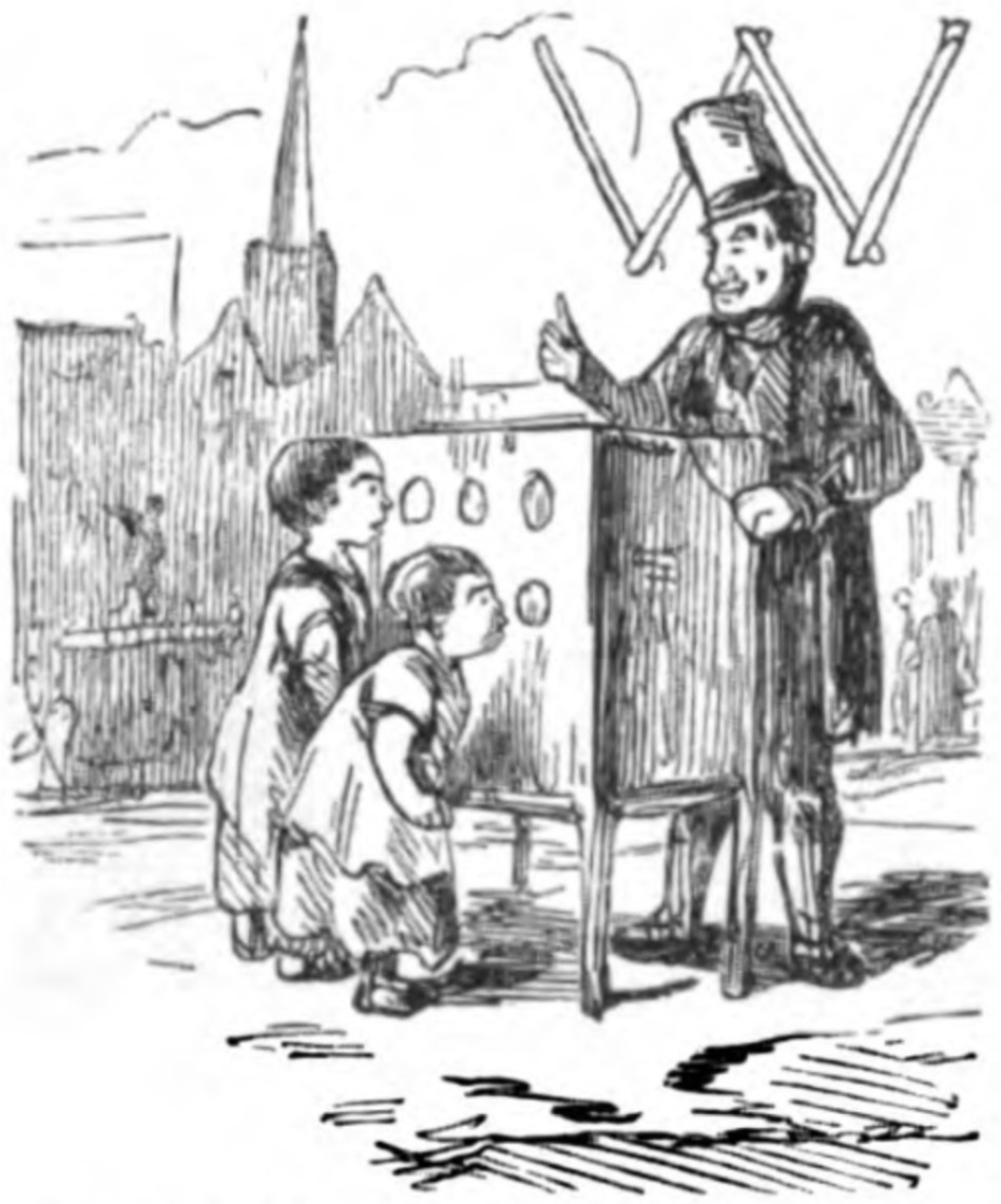 - Two small children peer into the holes cut in a cabinet. Behind the cabinet stands a man in a long jacket and tall hat with one hand raised. Behind his head, the letter W from Without is formed by four sticks.