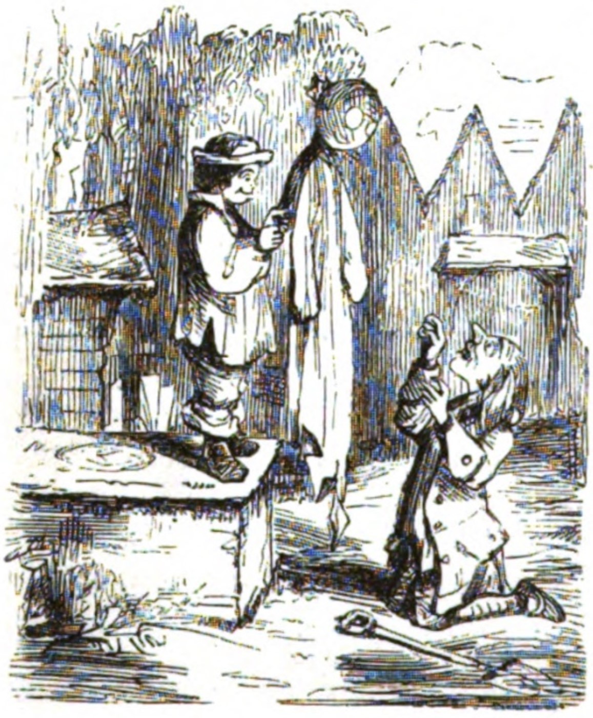 A satisfied looking boy standing on a rectangular box or platform holds in front of him a stick. On it are a turnip disguised as a head and a ragged sheet or coat, forming the semblance of a ghost. A terrified looking man is on his knees with his arms raised in front of the ghost, a shovel dropped beside him. A tall fence in the background forms the letter W from We.