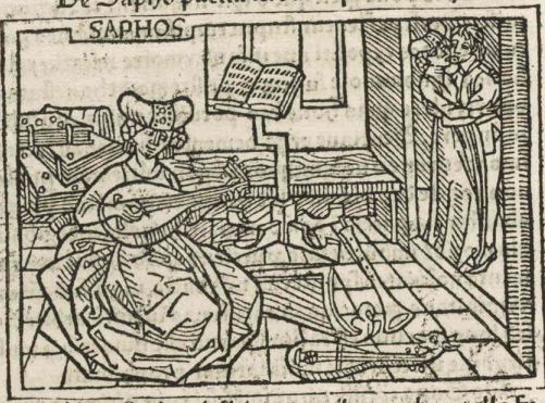 This engraving depicts Sappho, the famous poetess from Lesbos, sitting in the foreground while playing a stringed instrument. We know that this is Sappho as her name is engraved above her head. There are other stringed instruments and sheet music surrounding her. Sappho was in love with a man (depicted on the right-hand side of the engraving) who did not share the mutual feelings. Boccaccio explains that this is the reason as to why her poems and music verses were so somber.