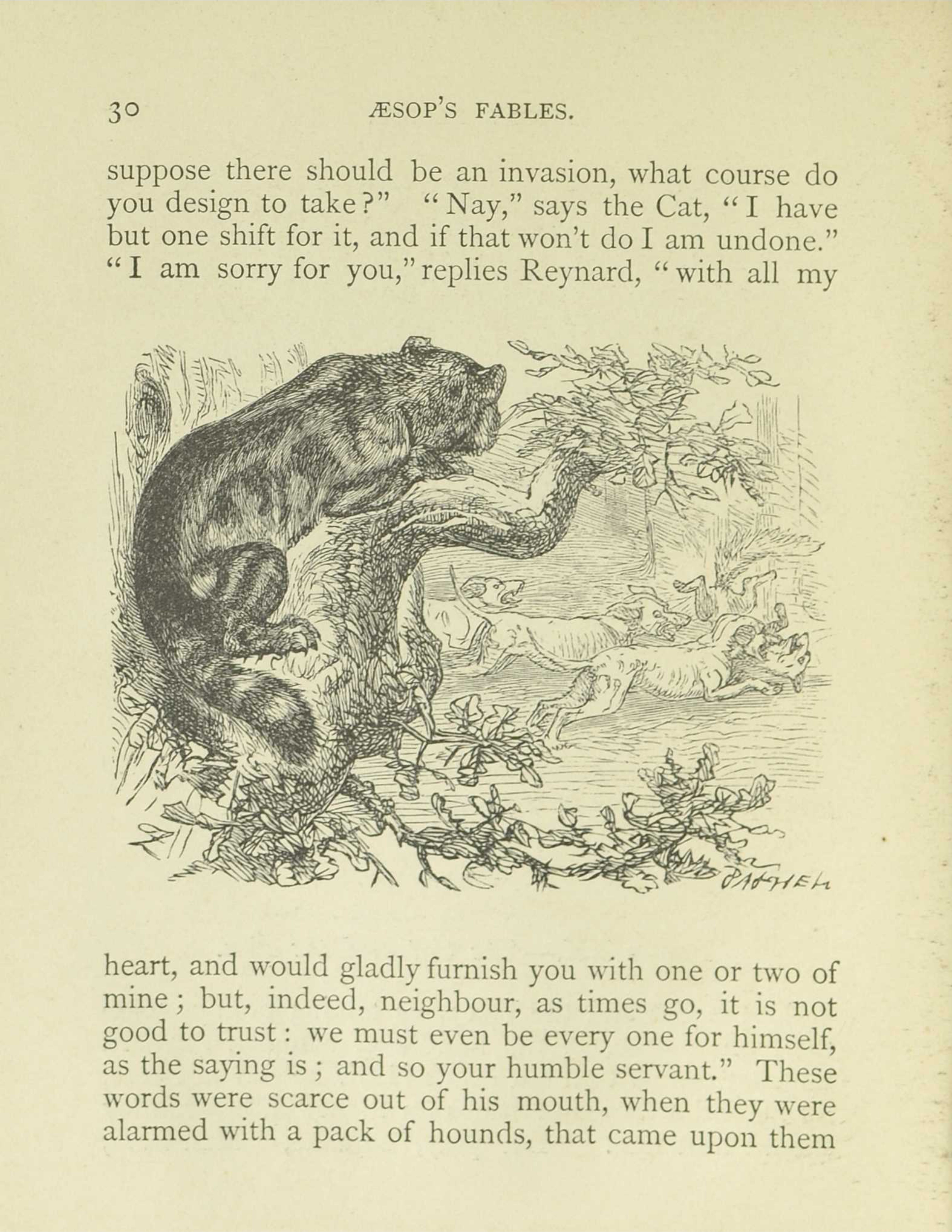 - As the Cat and the Fox were talking politics together, on a time, in the middle of a forest, Reynard said, let things tum out ever so bad, he did not care, for he had a thousand tricks for them yet, before they should hurt him.
