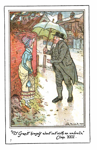 Here we see Mr. Grant going out in the rain with an umbrella to compel Fanny to come into the Parsonage. Fanny went into town on an errand for her aunts and got caught in the rain. She took shelter underneath a tree by the Parsonage. Mrs. Grant and Miss Crawford tried to convince her to come in and visit with them while she waited for the rain to pass, but she refused, not wanting to visit with them and be an inconvenience. Mr. Grant finally came outside and convinced her to come in. She waited with Miss Crawford until the rain passed. Fanny spent most of the visit watching the window for the rain to pass, wanting to leave as soon as the sky cleared. Miss Crawford entertained them by playing her harp for Fanny, who had never heard her play. This scene occurs in chapter 22 as noted underneath the title of this image. The characters are shown in the traditional regency style. Fanny wears the regency style dress with an empire waist. Her hair is worn tied up and wears a bonnet. She carries a small purse, hung on her wrist. Mr. Grant wears a waistcoat and tailcoat, and knickers that stop at the knee. The regency period dated to the early nineteenth century (1811-1820) when George, Prince of Wales, later George IV (r. 1820-1830), reigned as regent for his mentally ill father, King George III (r. 1760-1820). The regency period is associated with the rise of neoclassicism in art and fashion.