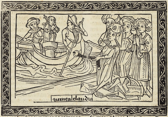 This engraving depicts Claudia Quinta, a Roman woman, standing on land as she pulls a ship to shore. Her name, written as Quinta Claudia, is engraved at the bottom of the image. Boccaccio explains that after Claudia Quinta was accused by other matrons of not being chaste, she prayed to the goddess Ceres to help prove her virtue. After a ship that contained a statue of Ceres had gotten stuck on a sandbar, Ceres gave Claudia Quinta the power to pull the ship to shore as proof of her chastity. The women who accused Claudia Quinta of being unchaste are standing behind her in the engraving as they watch her pull the ship to shore. The statue of the goddess is illustrated on top of a platform on the ship. Claudia Quinta’s name is engraved below her body to identify her.