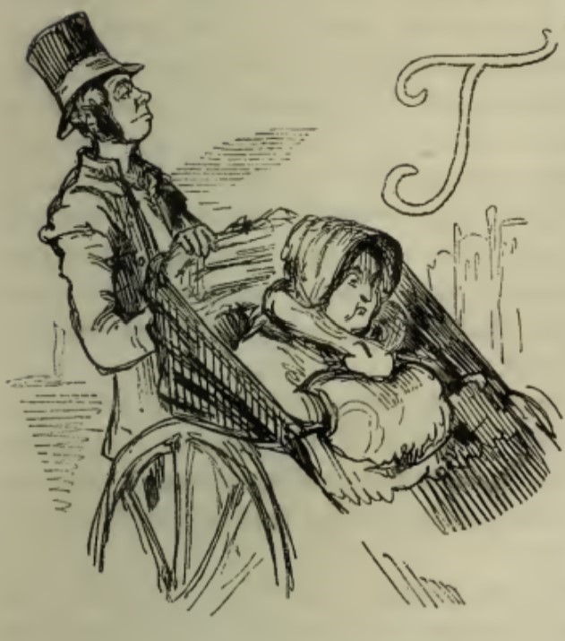 - Miss Matilda Crawley sits in her wheelchair, bundled up in a bonnet and muff. The chair is being pushed by a thin man in a coat and tall hat. In the top right of the image is the letter T from The.
