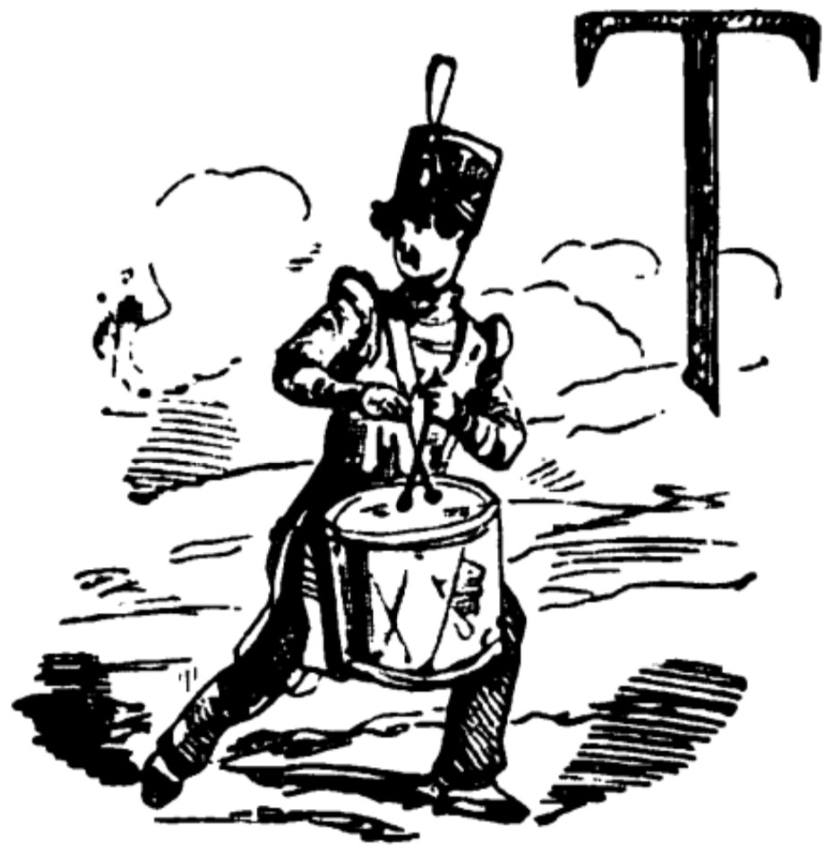 - A drummer boy glances fearfully around the battlefield as he plays a beat upon his drum. The background is of low hills and clouds of smoke, with the letter T from Thus in the top right corner.