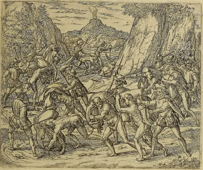 A group of Spaniards travel through Peru with several Indigenous men who have been forced to accompany the Spaniards to carry their packs. Every Indigenous man in the group carries at least one large pack, and sometimes multiple items. The Spaniards are merciless, beating or killing any Indigenous man who tires and slows or can no longer continue. They use wooden canes to beat the men, and in the background one Indigenous man who has fallen or been knocked to the ground is killed with a sword. In the distance, a volcano erupts. This image is identical to one found on page 20 (149) of Frankfurt, 1596.
