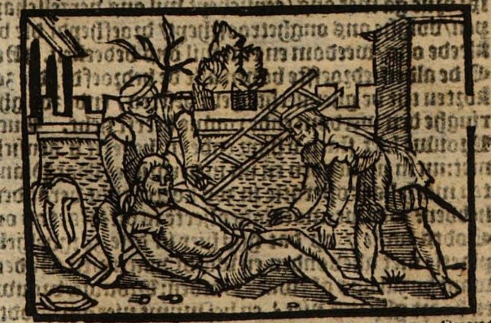 Calisto hears Sosia shouting in the street, and he climbs the garden wall to see the cause of the commotion. By the time he reaches the top of the wall, Sosia has already scared off Centurio’s men. Nonetheless, Calisto starts to descend the ladder on the outside of the wall, but he falls to his death. In this illustration, Calisto can be seen lying lifeless on the ground. His hat has fallen off and is now in the bottom left corner of the illustration. Sosia and Tristan are trying to rouse him, but death has already taken hold. In the background, we can see a shield (to the left) and, leaning against the wall, the ladder that proved to be Calisto’s demise.