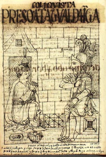 This chapter focuses on discussing the arrival of Spaniards and the Spanish conquest of Peru. This image depicts the imprisonment of the Inca emperor, Atawalpa Inca, after the Spaniards attacked and stole all the gold and silver they could take. Atawalpa Inca is illustrated sitting in a prison on the left side of the image with his hands and feet shackled together. There is a plate of food and water in front of him, but the author explains Atawalpa Inca would not eat due to the grief he had for the ransacking of his city and the capture of his wife. The soldier on the left is identified as the guarda [guard], who is illustrated watching and conversing with the Inca. There is a caption at the bottom of the image that identifies the location of the image as it reads, preso atagualpa en la cuidad de caxamarca [prisoner Atawalpa in the city of Cajamarca]. There is another description at the bottom of the image which reads, Atagualpa ynga dixo a don francisco pizarro que leyese un escrito, dixo que no sauia y dixo que leyse un soldado y leyo, dijo atagualpa … [Atawalpa Inca asked Don Francisco Pizarro to read him a letter, he said he did not know how to read and he told a soldier to read it, which he did. Atawalpa said …]. The rest of the caption is cut off.