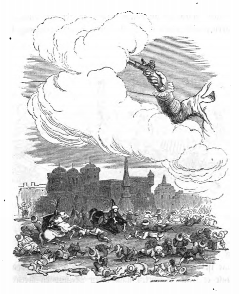 In this image Gulliver demonstrates his pistol to the Lilliputians. Gulliver’s right arm is visible, holding his pistol. A cloud of smoke emerges from the pistol. A crowd of Lilliputians cower on the ground, scared by the bang of the gunpowder. Two horses rear also scared by the noise. This image comes at the point in the story where Gulliver demonstrates his weapons to the people of Lilliput, including his rapier and his pistol, which he loaded with gunpowder to demonstrate its use. The town is visible in the background. The same image appears in the 1839 Krabbe edition.
