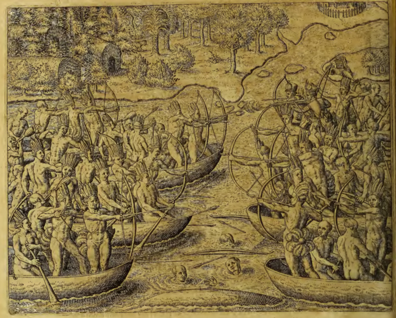 Two groups of Indigenous people engage in battle from canoes. Both groups are armed largely with bows and arrows and fire at each other, and members of both groups wear feathered headdresses and adornments around their waists. There are also a few individuals blowing into an object, perhaps a wind instrument or blow gun. Two European men stand in the prow of the canoe farthest from the viewer on the right, aiming long guns at the opposing group. There are several men in the water between the two groups of canoes.
