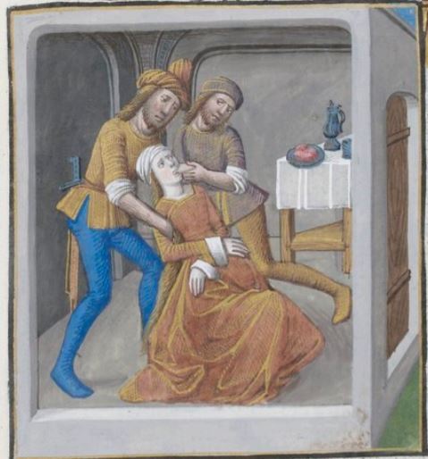 This image depicts Agrippina, the wife of Germanicus, being forced to eat food. Agrippina is depicted in the centre of the image on her knees as a man holds her arms back while the other man is forcing food into her mouth. She is being force fed under the orders of Tiberius. Tiberius is Germanicus’ father, and after he killed his own son, he sent his daughter-in-law Agrippina to prison. Agrippina decided to starve herself to death to avoid dying at Tiberius’ hands, however, Tiberius force fed her so that she would not die under her own circumstances.