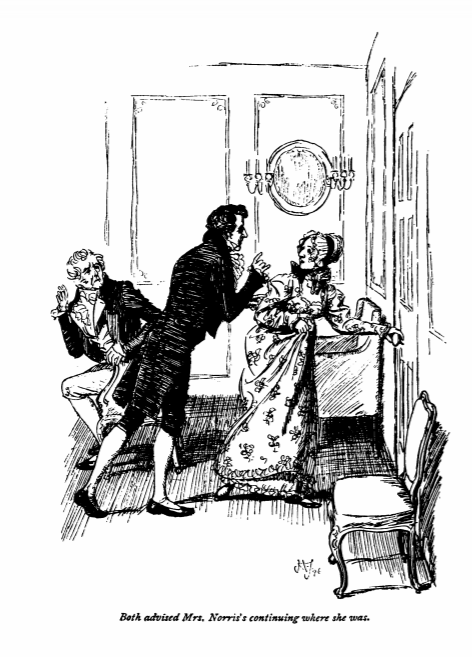 Here we see Edmund and Sir Thomas advising Mrs. Norris to stay in the drawing room rather than go out into the hall when Fanny’s brother, William, arrived. Both men advised Mrs. Norris that it would be better to let Fanny and William reunite alone, allowing them to join the rest of the group in the drawing room. This scene occurs in chapter 24. The characters are shown in the traditional regency style. Mrs. Norris wears the regency style dress with an empire waist, and a mop cap to cover her hair. Edmund and Sir Thomas wear waistcoats and tailcoats, and breeches that stop at the knee and cravats. The regency period dated to the early nineteenth century (1811-1820) when George, Prince of Wales, later George IV (r. 1820-1830), reigned as regent for his mentally ill father, King George III (r. 1760-1820). The regency period is associated with the rise of neoclassicism in art and fashion.