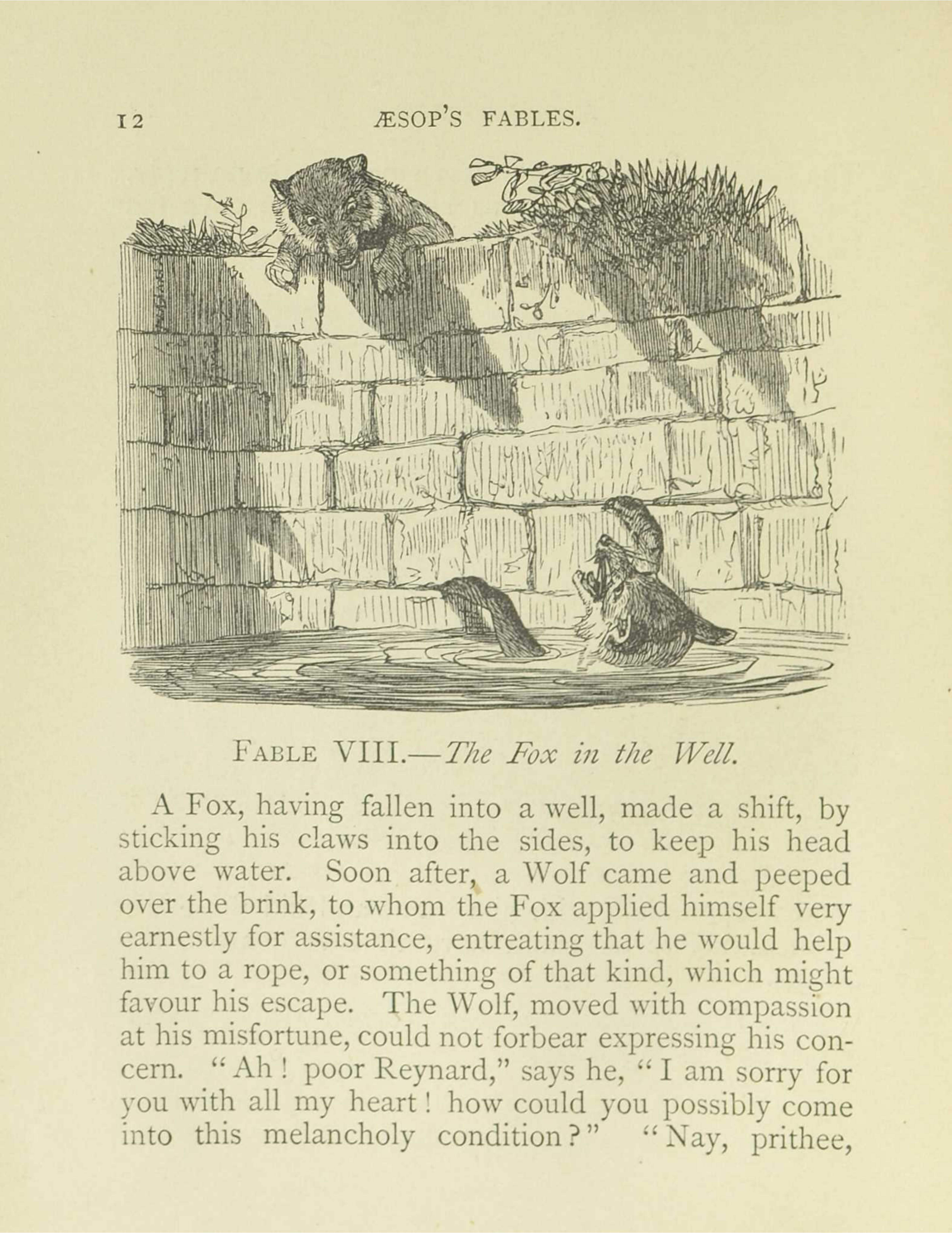 A Fox, having fallen into a well, made a shift, by sticking his claws into the sides, to keep his head above water. Soon after, a wolf came and peeped over the brink, to whom the Fox applied himself very earnestly for assistance, entreating that would help him to a rope, or something of that kind, which might favour his escape.