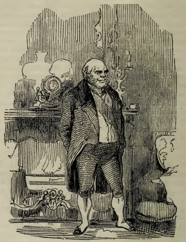 - Lord Steyne stands in front of an ornate fireplace topped with a clock and elaborate candelabra. He is short, bow-legged, and nearly bald, and dressed in fancy clothes with a coat and sash.