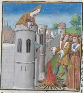 Dido, the founder and queen of Carthage, is illustrated on top of the city’s walls on the left side of the image stabbing herself with a knife. After her husband, Acerbas, had been killed by her brother, she fled to Africa and founded Carthage and vowed to remain chaste in honour of her husband. When a foreign king asked for Dido’s hand in marriage and threatened to sack the city if she denied, she stabbed herself to protect her chastity. The foreign king and his subjects are pictured on the ground in front of the castle and a fire.