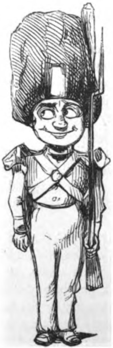 - A soldier in uniform with a tall hat and bayonetted musket stands at attention, looking to the left with a smile on his face.