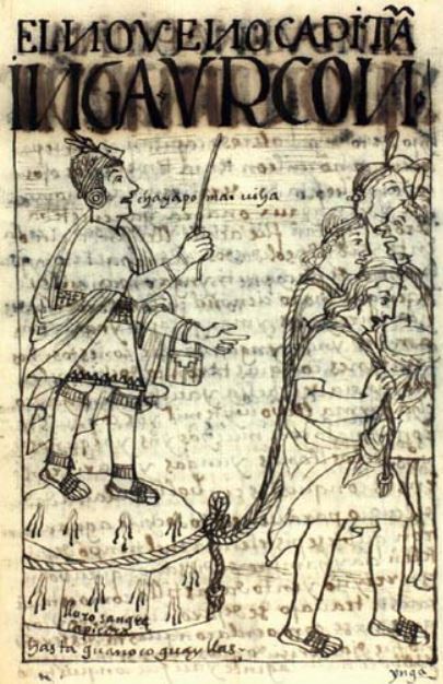 This illustration depicts the ninth captain Inca Urcon. These captains were a level of Inca authority who helped lead the conquest of the Andes. He was the son of Topa Inca Yupanqui, the king of the Inca Empire. The author explains that this captain was tasked with bringing large stones from Cusco to Huanuco (written as Guanoco at the bottom of the image). Therefore, he is illustrated standing atop a large stone on the left side of the image as his men pull the stone with rope. There is writing on the stone which says, lloro sangre la piedra which translates to the stone wept blood. He wrote this because the stone refused to move.
