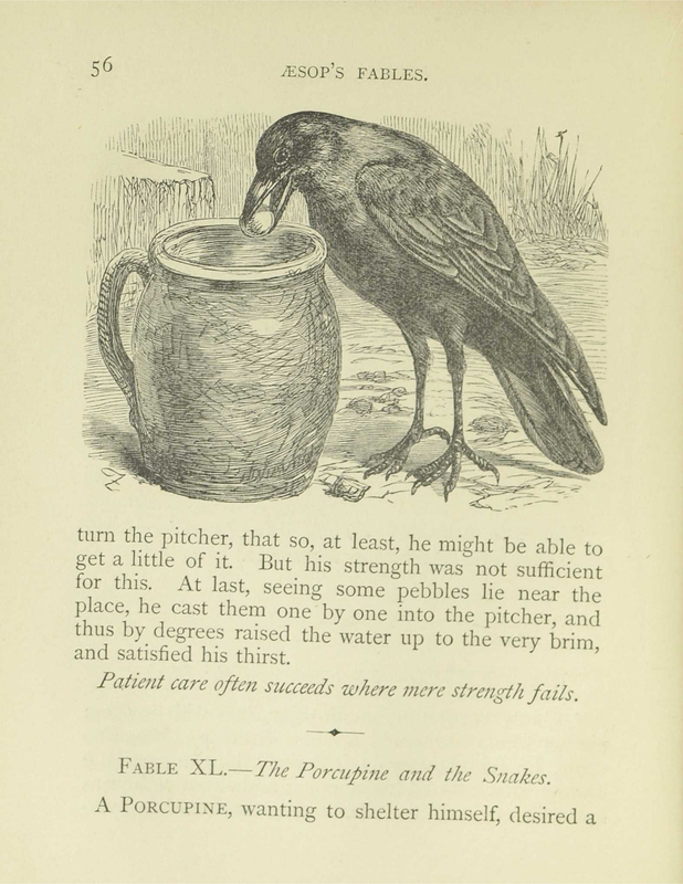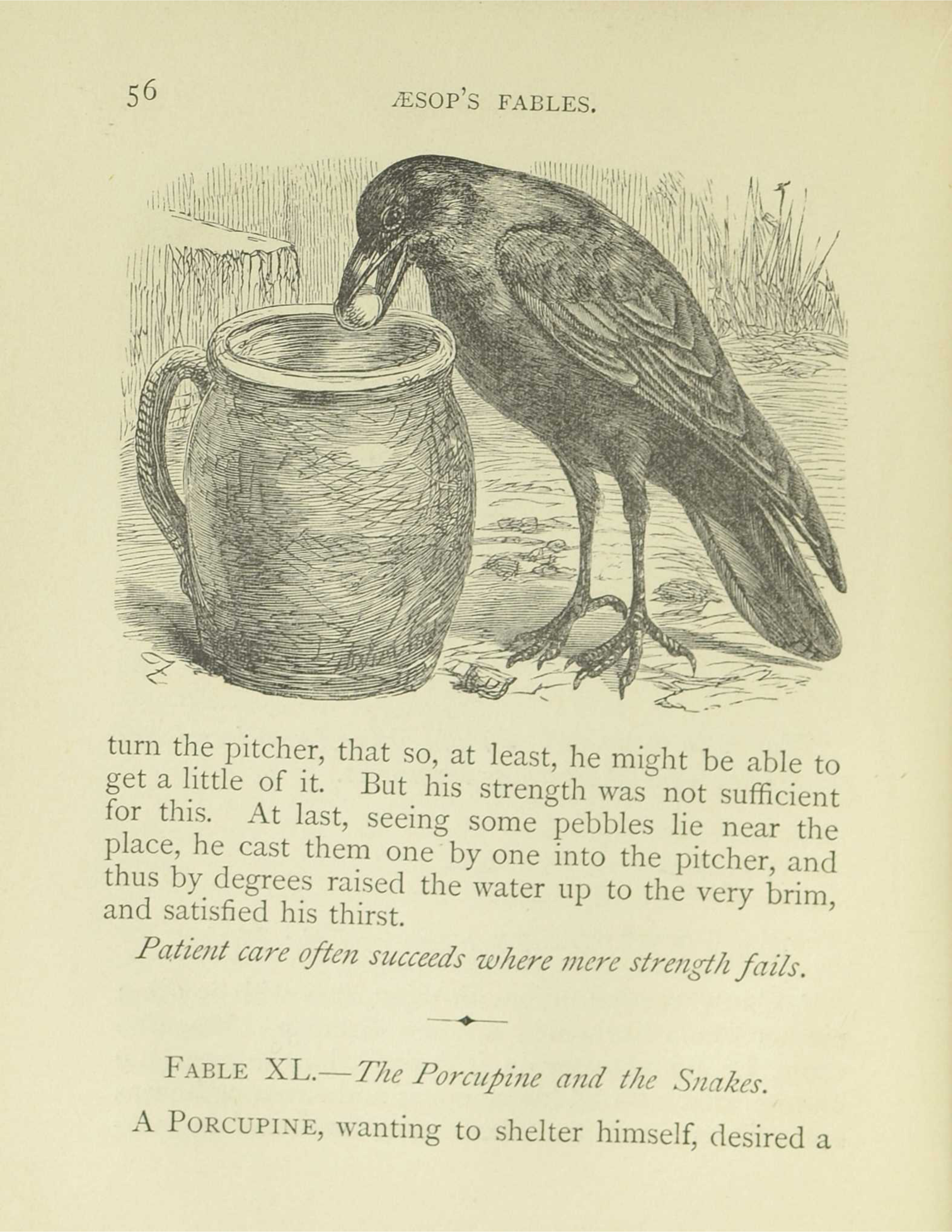 - On the left side of the image there is a large pitcher in the foreground. On the right side of the image sits a crow dropping round pebbles into the pitcher, with one in its mouth ready to drop. In the background there is a bit of foliage in what appears to be a forest clearing.