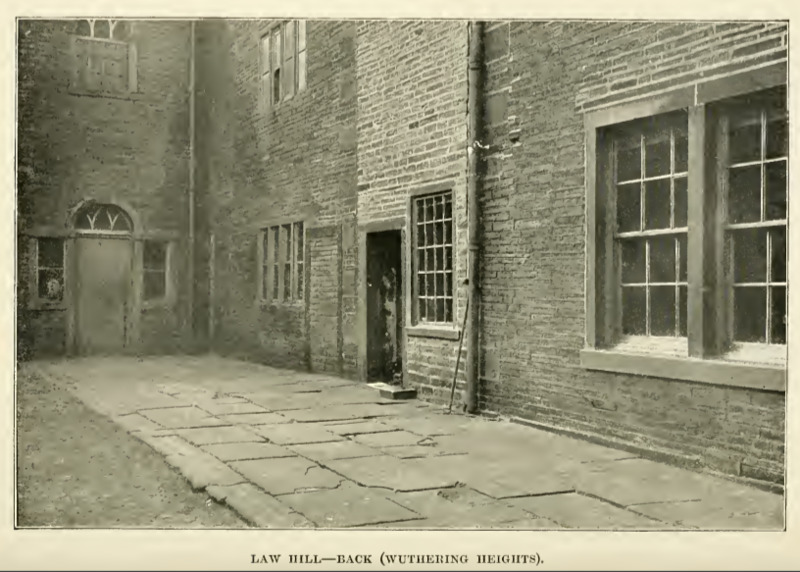 Here we see an image of Law Hill, a house near Halifax, England, on which Emily Bronte based the estate of Wuthering Heights. In this image we see the back of the house, taken from the courtyard on the back entrance to the house. This is the second in a series of photographs of the house, with others of the front and the outbuilding. The image is a reproduction of a photograph using a technique called photogravure, where photographs are taken on plates which could then be etched on to create a plate for use in a printing press.