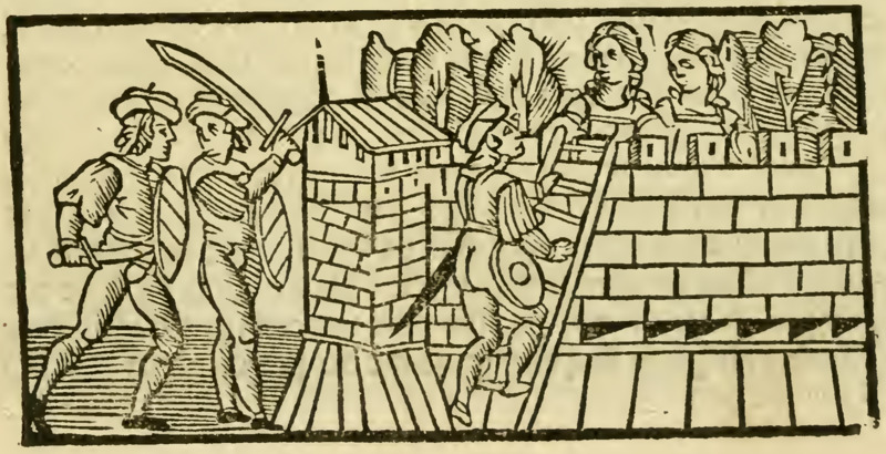[Act XIX (First Illustration) – Calisto Ascends Toward Melibea and Lucrecia While Sosia and Tristan Stand Guard (Repeated)]