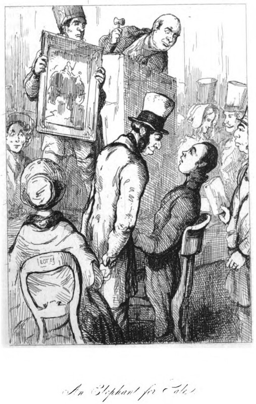 At the auction of the Sedley estate, Mr. Blowman holds up a portrait of Joseph Sedley riding an elephant to show the buyers. William Dobbin is seated directly in front of the painting, looking up with a startled expression at the bearded man looming over him. Mr. Hammerdown is peering down at the two men from the auction block, holding his mallet up. Among the figures in the background, on the right side of the picture, are Rawdon and Rebecca Crawley, who purchase the painting. Below the illustration is printed in cursive its title, An Elephant for Sale.