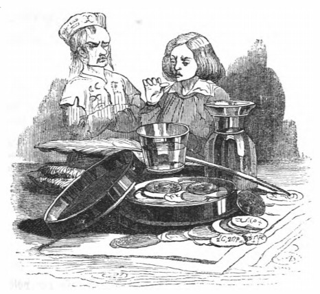 A professor from the mathematical school at the Grand Academy of Balnibarbi conducted experiments in teaching and learning. His idea was to write concepts on a thin wafer in a cephalic tincture then have the students consume the wafers and eat nothing else except bread and water for the subsequent three days. The idea was that the tincture would travel to the student’s head and bring the concept with it. This idea is playing off of the Catholic communion wafers, and as Swift is writing from an Anglican perspective, a swipe at the Catholic doctrine of transubstantiation. In this image we see a tray with the wafers with concepts written on them. There is also a quill and a bottle of liquid that is the cephalic tincture. A young student holds the wafer in his hand, while the professor looks on. The same image appears in the 1839 Krabbe edition.