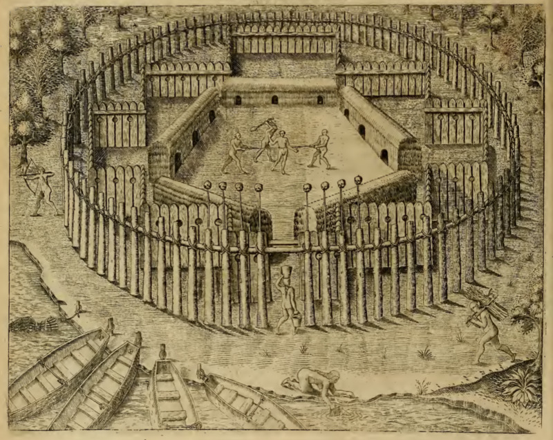 A Tupinambá village is shown, comprised of five long structures arranged in a pentagram and surrounded by two fences, with skulls mounted on ling poles at the entrance. At the center of the village a captive man is about to be executed. He is restrained by two men, each holding one end of a rope that is tied around his waist. A third man stands behind the captive with a club raised above his head. The village is located near the coast. Women fetch water in pails and carry it into the village, and several canoes are pulled up along the shore. Men also hunt and bring firewood to the village.
