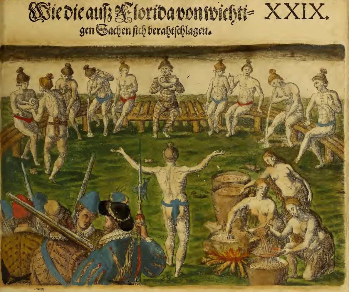 A group of Indigenous people is shown. Several men sit on wooden benches that are arranged in a semi-circle. Two men hold large shells, and two appear to be vomiting onto the ground. Three women tend to large pots on the right. To the left of the women, and individual stands with their arms outstretched. In the foreground, a group of colonists stand holding rifles. This illustration is identical to the one found on page 99 of Frankfurt 1591, but colored.