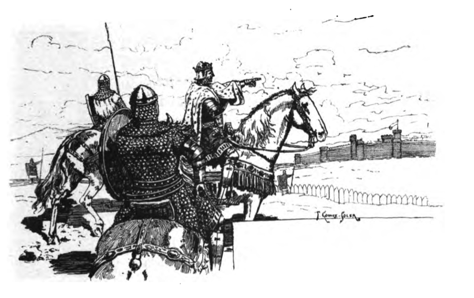 In this image there are three men on horses, the king Sancho, El Cid, and a soldier. The one in the front is the king with his crown and long flowing white cloak. The one in the back is El Cid, he is wearing chainmail and a helmet. He is carrying a shield and at his waist a sword is visible. The other soldier is wearing chainmail and a helmet as well and is carrying a spear and shield. In the background of the field there are two more soldiers holding spears. The building that the king is pointing at is a stone castle protected by wooden spikes.