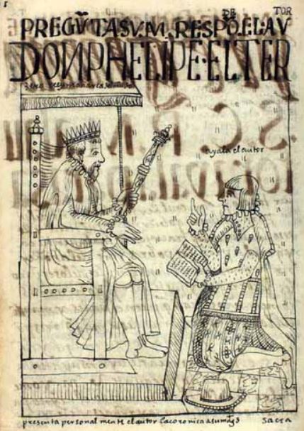 This image represents an imagined meeting and conversation between the author of the book and the king of Spain. The author prepared this book to present to the king of Spain in the hopes that they could discuss how to save the indigenous peoples of Peru. The author of the book, Felipe Guaman Poma de Ayala is depicted kneeling on the right side of the image as he presents his book to the king. The caption above his head reads, ayala, el autor [Ayala, the author]. The king, Philip III, is depicted sitting on a throne on the left side of the image wearing a crown and holding a long staff in his left hand. The caption at the bottom of the image reads, Presenta personalmente el autor la Corónica a su Magestad [The author personally presents the Chronicle to His Majesty].