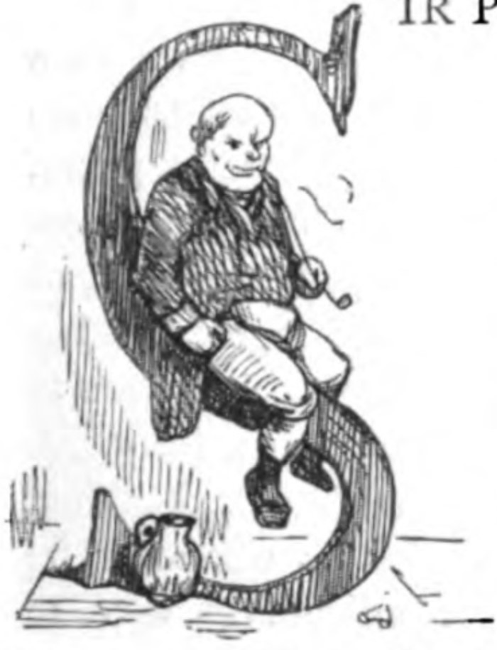 - Sir Pitt Crawley is shown sitting on the letter S of Sir. He is smoking his pipe. At the base of the S is a pitcher.