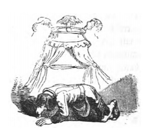 - This image is a satire on the licking ceremony at the court of Luggnag. The image is of the body of a person with the head of a dog licking the ground. This is showing the subservience that was expected of courtiers. This subservience was also expected in European courts and thus serves as a satire on European monarchies. The same image appears in the 1839 Krabbe edition.