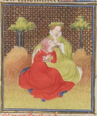 This image depicts the story of a young Roman woman who saved her mother from starving to death. Boccaccio explains that this young woman’s mother had been sentenced to death, and when she was locked away to die of starvation, her daughter saved her with her own breast milk. The young woman is depicted sitting down with her breast exposed as she provides milk to her mother. The young woman’s belly is large as she had just given birth, which is why she is able to produce the milk. Boccaccio explains that he wrote on this unknown young woman due to her filial devotion.