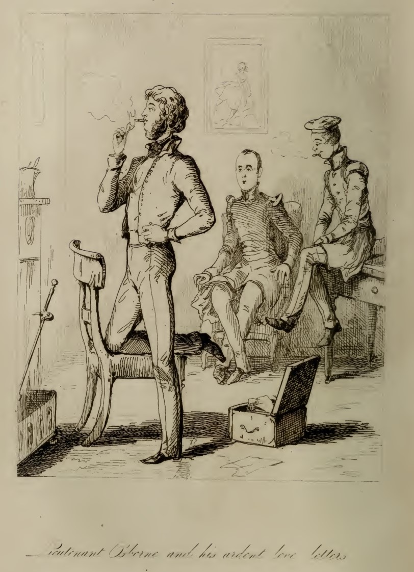 George Osborne stands facing the fireplace with one leg resting on a wooden chair, smoking a cigar which he has lit using a love letter. At the base of the chair is an open chest, filled with letters from Amelia Sedley. Two other officers are seated in the background. One is sitting on the edge of the desk, also smoking. The other is Dobbin, seated in an armchair over which a portrait of a woman hangs, looking appalled. Below the illustration is printed in cursive its title, Lieutenant Osborne and his ardent love-letters.