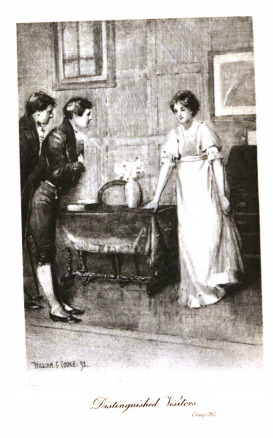Here we see Miss de Bourgh, Lady Catherine de Bourgh’s niece visiting Mr. Collins at the parsonage. Lady Catherine was Mr. Collins's patron, and visited him on occasion, but more frequently asked Mr. Collins and his wife, Charlotte, to join her at her home called Rosings. Elizabeth Bennet went to visit her good friend Charlotte, who married Mr. Collins after Elizabeth rejected his marriage proposal. Miss de Bourgh stands with her hand on the table, as Mr. Collins bows his head to her, with Mr. Darcy standing next to him. This scene occurs in chapter 30 as noted underneath the title of this image. The characters are shown in the traditional regency style, with the men wearing waistcoats, tailcoats, and knickers that stopped at the knee. Miss de Bourgh wears the regency style dress with an empire waist. Her hair is worn tied up, as was tradition for women after their coming out before the queen, signaling her entrance into society. The regency period dated to the early nineteenth century (1811-1820) when George, Prince of Wales, later George IV (r. 1820-1830), reigned as regent for his mentally ill father, King George III (r. 1760-1820). The regency period is associated with the rise of neoclassicism in art and fashion. The same image appears as the frontispiece for the Dent 1893, 1894, 1895, 1896, and 1897 editions of Pride and Prejudice.