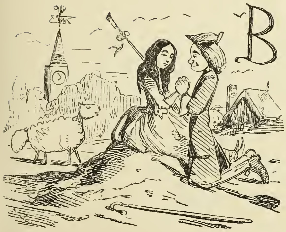 A scene depicting the simple and happy country life. A shepherdess is depicted sitting on a small hummock, where a man in uniform kneels before her, clasping her hand in his. Both are looking contentedly at the other. Her crook lies on the ground beside the hummock, and behind it is one of her sheep. In the background are a farmhouse and clocktower, and the top right of the image is the letter B from Besides.