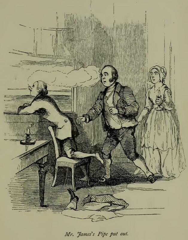 Mr. James Crawley, while visiting his aunt Miss Matilda Crawley, leans out the bedroom window while smoking his pipe. He is in his coat and breeches, with his pants and shoes in a pile on the floor next to the chair on which he is leaning. Behind him, Mr. Bowls and Mrs. Firkin have rushed into the room to stop the smoke, which is bothering Miss Crawley downstairs. Below the illustration is printed its title, Mr. James’s pipe put out.