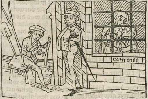 This engraving depicts a story of a young Roman woman who saved her mother from starving to death. Boccaccio explains that this unknown woman’s mother had been sentenced to death, and when she was locked away to die of starvation, her daughter saved her with her own breast milk. The girl and her mother are depicted behind the window of the jail cell as the mother drinks the milk of her daughter’s breast. The word romana is engraved below the jail cell window. The men that are standing guard outside the prison cell seem unconcerned and relaxed. They are unsuspecting of the young woman because they searched her every time she visited her mother and she never seemed to carried food with her. The young woman saved her mother’s life through her breast milk, and Boccaccio explains that he wrote on this unknown young woman due to her filial devotion.