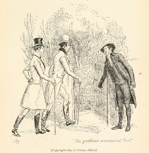 In this image Mr. Collins pays his respects to Mr. Darcy and Colonel Fitzwilliam, who had just arrived at Rosings. Mr. Darcy and Colonel were Lady Catherine’s guests, and Mr. Collins called on them soon after they arrived, as was customary. This scene occurs in chapter 30. The characters are shown in the traditional regency style. Mr. Collins, Mr. Darcy, and Colonel Fitzwilliam wear waistcoats and tailcoats. Mr. Darcy and Colonel Fitzwilliam wear top hats and carry walking sticks. The regency period dated to the early nineteenth century (1811-1820) when George, Prince of Wales, later George IV (r. 1820-1830), reigned as regent for his mentally ill father, King George III (r. 1760-1820). The regency period is associated with the rise of neoclassicism in art and fashion.