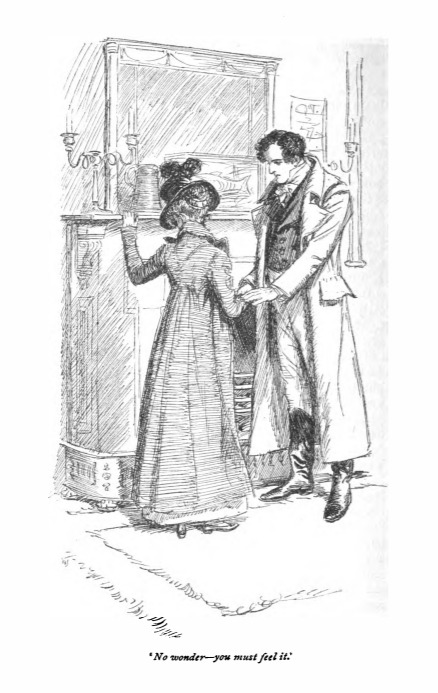 In this image Edmund comes to Portsmouth to bring Fanny and Susan back to Mansfield Park. Upon seeing Fanny for the first time in three months he notes that Fanny looks ill. He then attributes it to her worrying about the scandal with Maria and Mr. Crawford who had been pursuing Fanny. The reality was that Fanny had not been eating well due to her parents' poverty. This scene occurs in chapter 46. The characters are shown in the traditional regency style. Fanny wears a regency style dress and coat with an empire waistline and a bonnet. Edmund wears a waistcoat, tailcoat, and overcoat, with breeches. The regency period dated to the early nineteenth century (1811-1820) when George, Prince of Wales, later George IV (r. 1820-1830), reigned as regent for his mentally ill father, King George III (r. 1760-1820). The regency period is associated with the rise of neoclassicism in art and fashion.