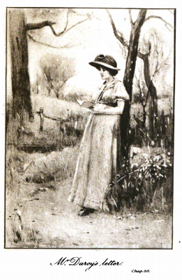 Here we see Elizabeth Bennet leaning against a tree, reading a letter from Mr. Darcy. In this letter, Mr. Darcy outlines the reality of the character and his relationship with Mr. Wickham. Mr. Wickham was a militia officer stationed in the town near Longbourn. He was very charismatic and Elizabeth’s sister, Lydia, ran away with him and got married, much to the distress of the rest of the Bennet family. Mr. Darcy disapproved of Mr. Wickham, as Wickham was Mr. Darcy's father’s godson, and Wickham tried to marry Darcy’s sister, Georgiana, in order to obtain her wealth. Wickham also inherited some money from Mr. Darcy’s father with the intention that he join the clergy, but he did not follow through with his clerical studies. In this letter he also explained why he split up Jane and Mr. Bingham, because he did not realize their mutual love. Darcy explained to Elizabeth that he thought Jane unworthy of Bingley and persuaded him to leave Netherfield. In his letter, he apologized for this misjudgment. The letter was intended to address Elizabeth’s accusations regarding his pride, and Elizabeth’s prejudices against him. The letter marks a shift in Mr. Darcy’s character and the beginning of the real love between Elizabeth and Darcy. This scene occurs in chapter 35 and is noted underneath the title of this image. The characters are shown in the traditional regency style, with Elizabeth wearing the regency style dress with an empire waist. Her hair is worn tied up, as was tradition for women after their coming out before the queen, signaling her entrance into society. She wears a bonnet to protect her face from the sun, common in regency style. These bonnets were a popular fashion because during this period one of the favourite pastimes of young women was going for walks, referenced frequently in Austen’s novels. The regency period dated to the early nineteenth century (1811-1820) when George, Prince of Wales, later George IV (r. 1820-1830), reigned as regent for his mentally ill father, King George III (r. 1760-1820). The regency period is associated with the rise of neoclassicism in art and fashion. The same image appears as an insert between pages 12 and 13 for the Dent 1893, 1894, 1895, 1896, and 1897 editions of Pride and Prejudice.