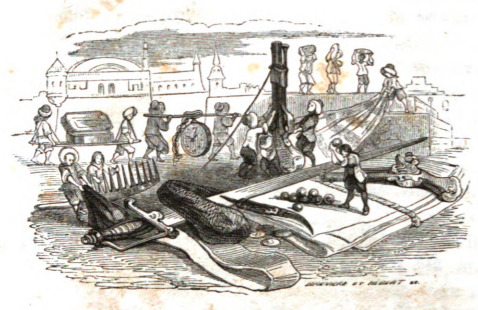 Here we see the Lilliputians taking an inventory of Gulliver’s belongings. In the foreground we see Gulliver’s sword and pistol. A Lilliputian is standing on a stack of paper counting bullets in the foreground. Two Lilliputians examine Gulliver’s comb, while others look at his telescope. In the background we see Lilliputians using sticks to carry Gulliver’s small box and pocket watch. In the distance we see other Lilliputians carry some other things on their heads and shoulders. The city skyline is visible in the background. The same image appears in the 1843 Krabbe edition.