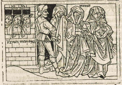 The engraving depicts a man guarding a jail, with three figures standing behind the bars of the jail and three figures leaving the jail covered in their garments. The three figures leaving the jail are Minyan men who had been sentenced to death for their crimes against their city. Boccaccio explains that the Minyans wives had gone into the jail and swapped clothing with their husbands and switched places. The men, in disguises, slipped past the guards unnoticed and into freedom, while their wives were executed in their place. Boccaccio explains that he chose to write on these women to demonstrate that there is no greater love than a wife’s love for her husband.