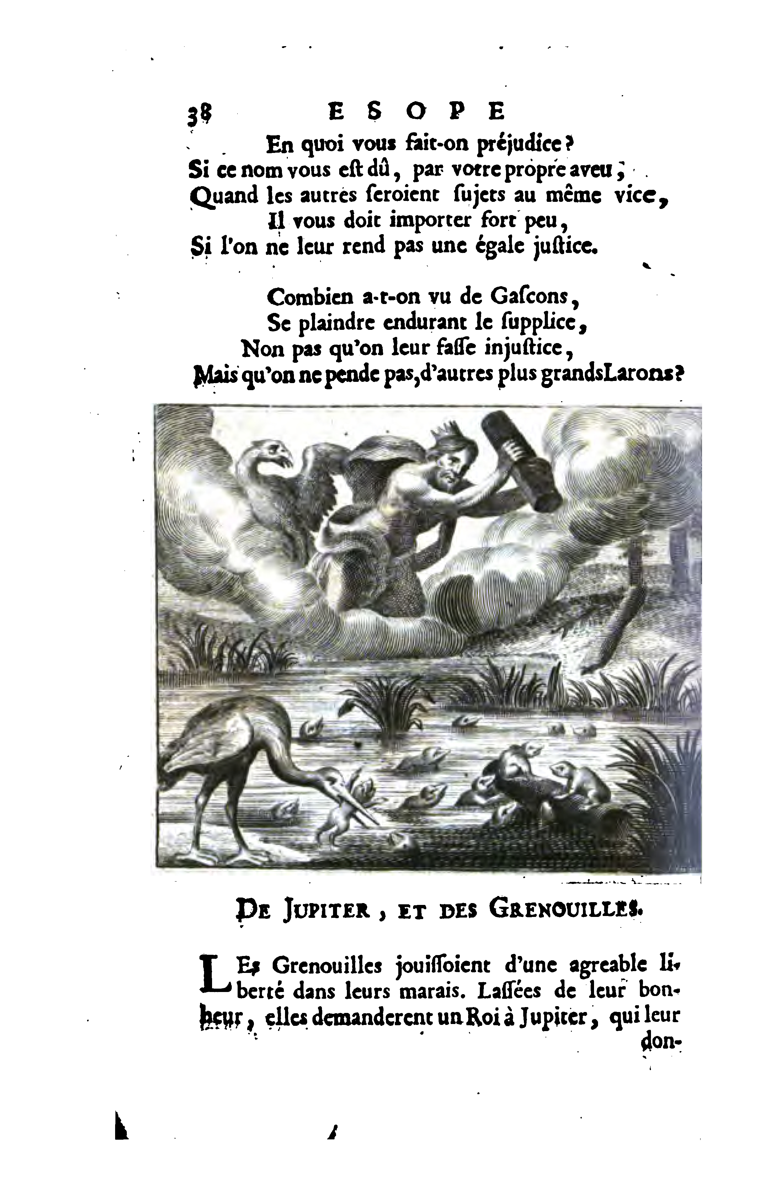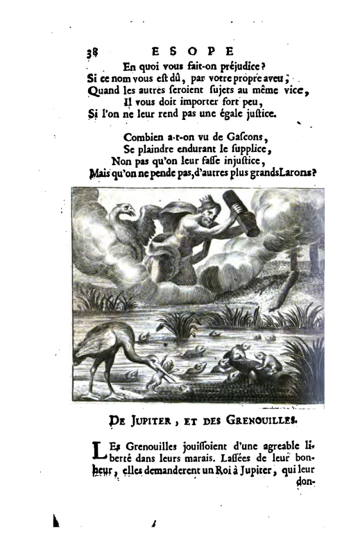 There is a bird resembling a crane eating a tadpole from a river. In the river there is school of tadpoles or frogs and some are sitting on a bark of a tree near the river. There are some water plants near the river. Behind them there is a greek god of Jupiter with a crown holding a cylindrical pole emerging from the clouds. An eagle is right behing the greek god Jupiter also behind the clouds.