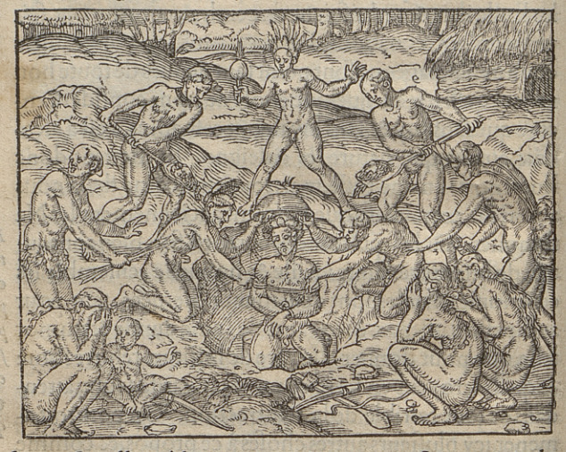A group of Indigenous people are in the process of burying the body of a deceased man. The body has been bound with rope about the arms and wrists and has been placed into the grave in a kneeling position. Two men kneel on either side of the grave each gripping one of the deceased man’s arms and holding a basket over his head. Two different men shovel dirt into the grave, and a third stands at the head of the grave holding a rattle or ornament and wearing a feathered headdress. Three women, one with a child by her side, crouch around the grave with their hands over their faces in distress, and there are bows and a club on the ground near their feet, perhaps to be buried with the deceased. This image is identical to one found in Frankfurt, 1557.