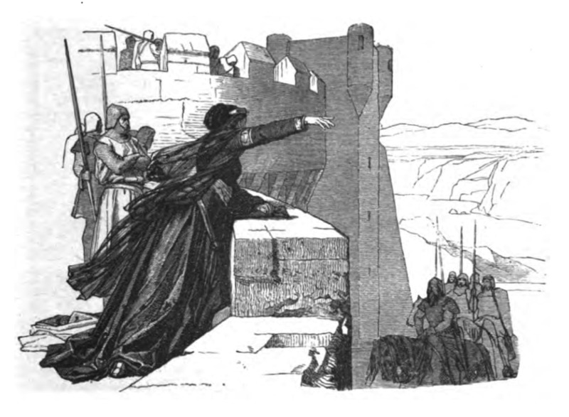 In this image Doña Urraca is leading her soldiers from the fortified wall of her castle. She is wearing a dark long flowing dress. There are soldiers next to her and they are all wearing armour and helmets. Two of them are carrying spears. On the tower next to these men there are more soldiers. Behind the tower with the soldiers there is another larger tower visible. Below the fortified wall there are more soldiers on horses carrying spears, those are the ones Doña Urraca is ordering. In the background there are mountains and a river.