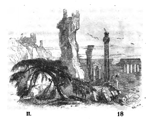 Here we see the ruins of an ancient city. There are partial columns and sections of porticoes. The architecture suggests that this was a Roman city, possibly Pompeii. There is a large tower in the centre of the image, with a tree that is curving back towards the ground creating an archway in the foreground. Archaeology and the excavations of Pompeii and Herculaneum were well underway when this edition of Gulliver’s Travels was published in 1839, and images of the ruins were being sent all over the world. This image comes at the end of the tenth chapter, in which Gulliver learns about the immortals on Luggnag. The same image appears in the 1843 Krabbe edition.